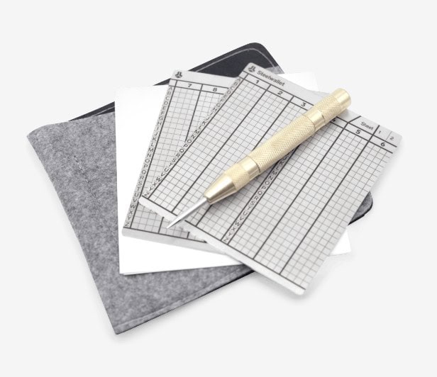 Steelwallet is another seed phrase backup solution that uses 304 stainless steel to offer solid durability against fire, corrosion, and mechanical damage. What sets it apart is the etching method. Instead of pre-made tiles, you manually engrave or stamp the seed words yourself onto two metal plates using a punch kit.